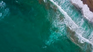 Aerial view of the Mediterranean coast, waves reach the deserted sandy beach