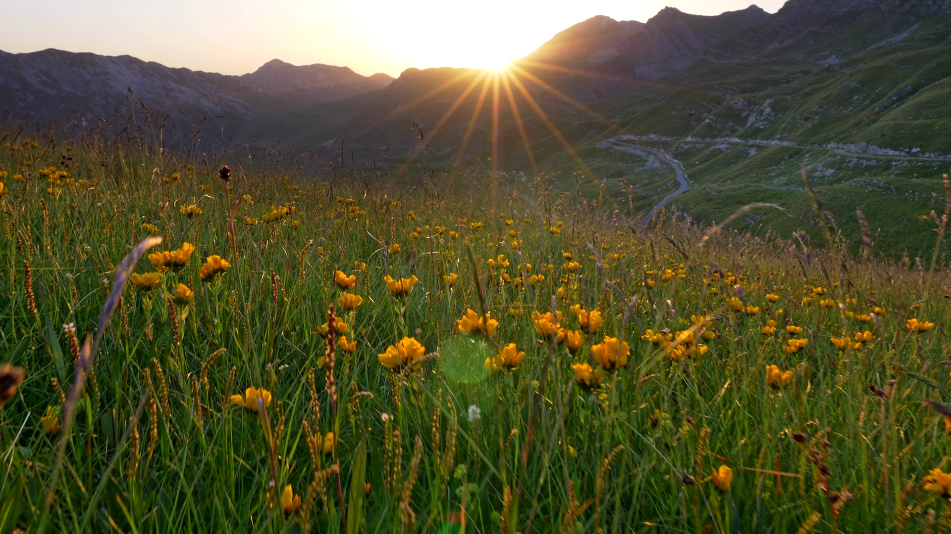 Alps During Sunset Bright Orange Beams Of Sun Appearing From Behind A Mountain And Shining On Yellow Wild Flowers And Green Grass In AnÂ