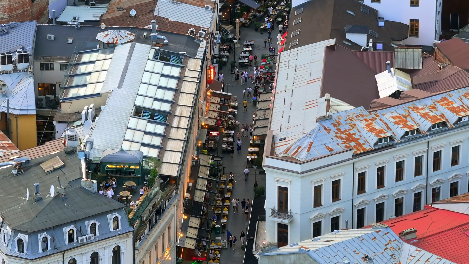 Bucharest Romania August 10 2024 Aerial Drone View Of People Moving Near Terraces In The City CentreÂ