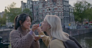 Female Tourist Eating Local Food in Amsterdam, Netherlands