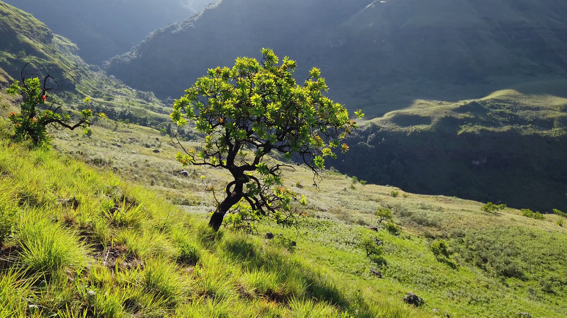 Panning View Of The Drakensberg Mountains With Lush Vegetation Of Summer South Africa