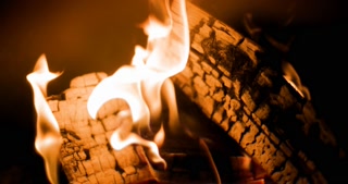 Close-up of a burning log with vivid flames and glowing embers, generating warmth and a cozy atmosphere in the dark