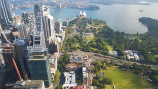 Aerial drone view of Sydney City CBD looking from the east side looking toward Sydney Harbour in December 2022