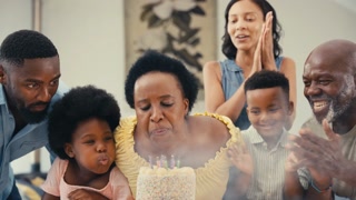 Multi-Generation Family Celebrating Grandmother's Birthday At Home Blowing Out Candles On Cake