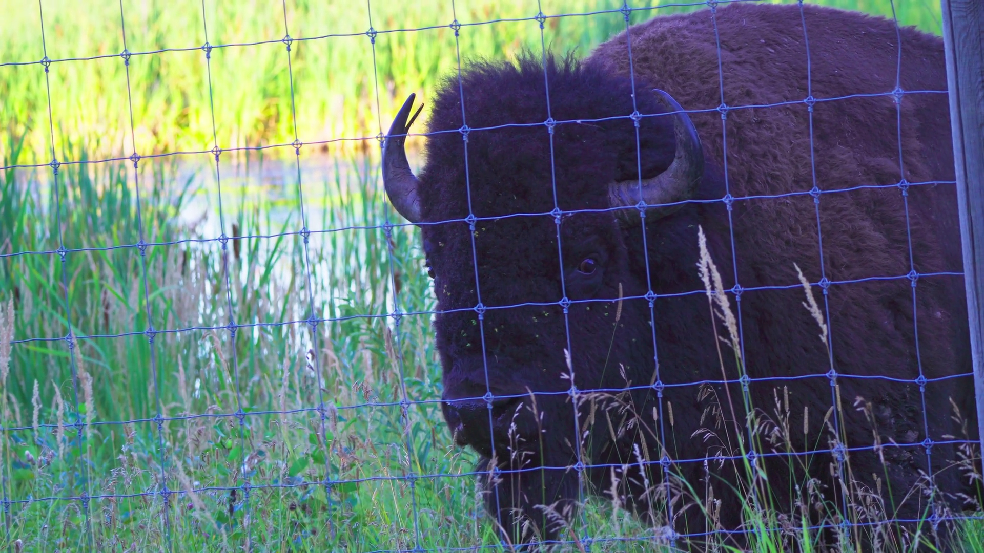 Wildlife Scene Bison Feeding By A Picturesque LakeÂ